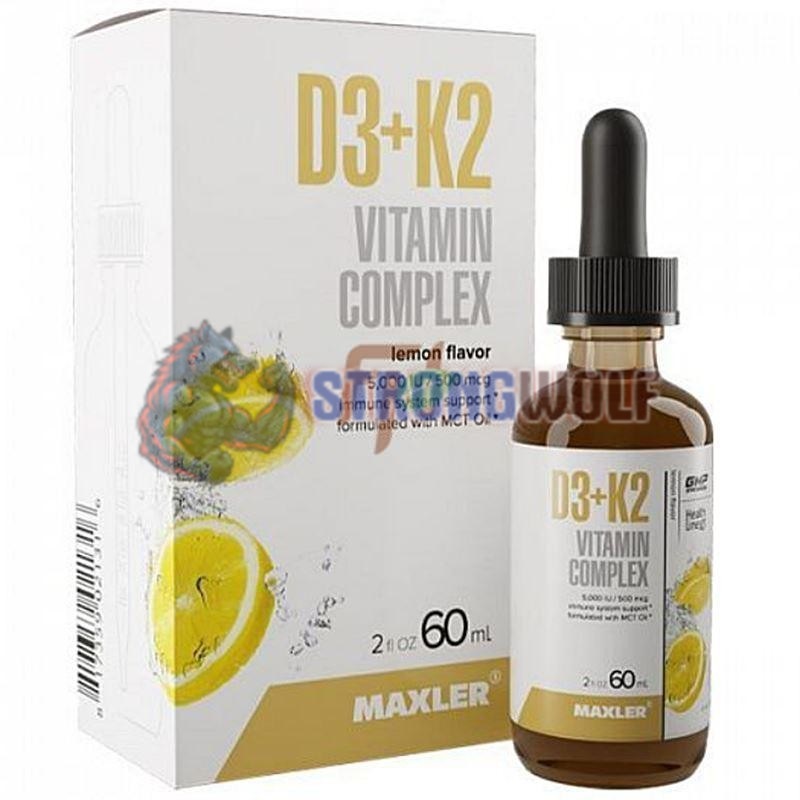 Комплексная пищевая добавка от бренда Макслер содержит жирорастворимые витамины Д3 и К2 в жидкой форме, растворенные в масле триглицеридов средней цепи (MCT) с натуральным вкусом лимона и натуральным подсластителем, без сахара.