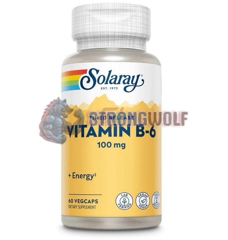 Пищевая добавка от американского бренда Соларей содержит витамин B6 (пиридоксин гидрохлорид) с функцией постепенного высвобождения, в веганских капсулах в дозировке 100 мг, что составляет 5882% суточной нормы потребления. Количество порций в упаковке: 60