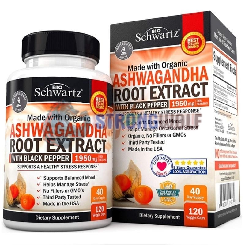 Пищевая добавка от американского бренда Биошварц содержит экстракт органического корня ашваганды, стандартизированный по содержанию 2, 5% витанолидов, в дозировке 650 мг на каспулу. Содержит усилитель биодоступности - пиперин из экстракта черного перца.